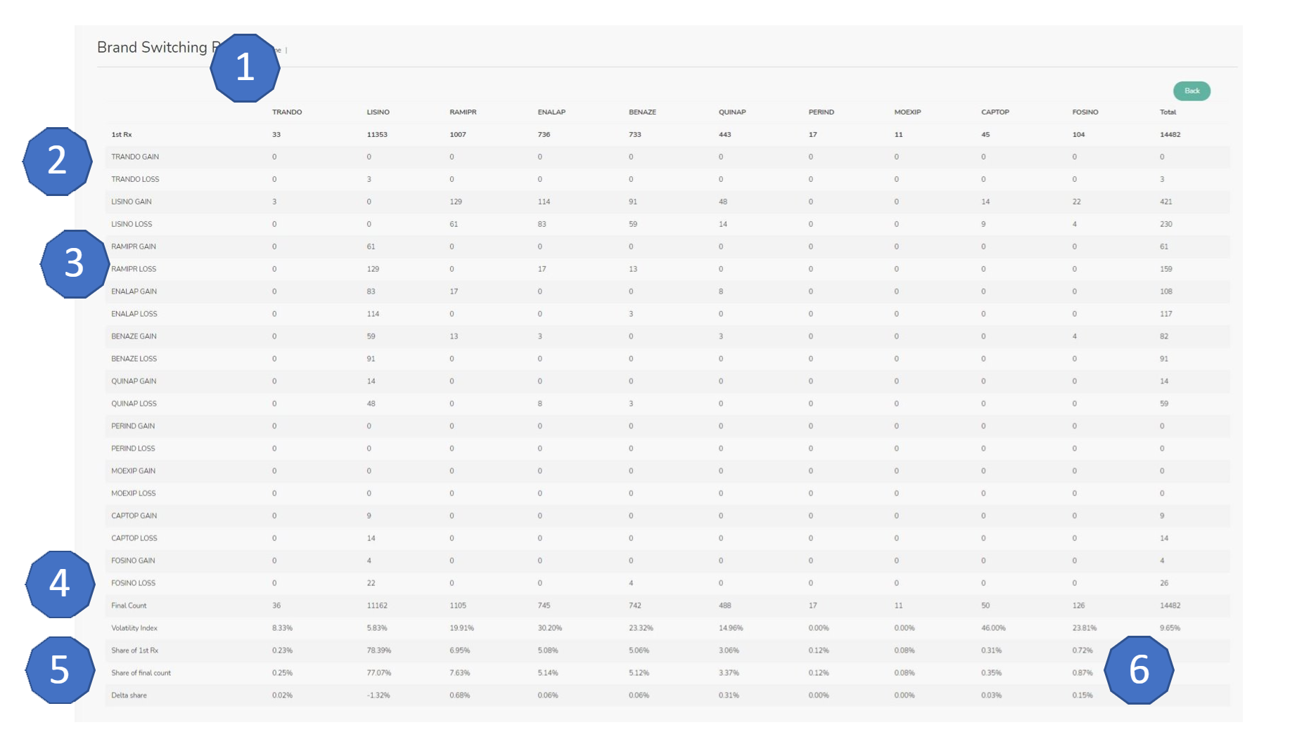 5. Volatility Index is a measure of how much each drug is switched (total gains and losses / Final Count)​;